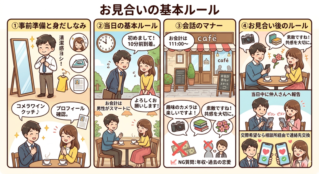 - 連絡先交換: 基本的にお見合いの場での直接的な連絡先交換(LINEなど)は控え、仲人や相談所を通じて行うのがルールです。