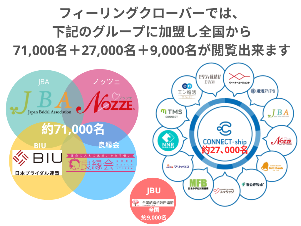 大手の結婚相談所パートナーエージェントや他の結婚相談のグループTMS、NNR等の会員様の閲覧が出来るようになり、幅が多く広がります。